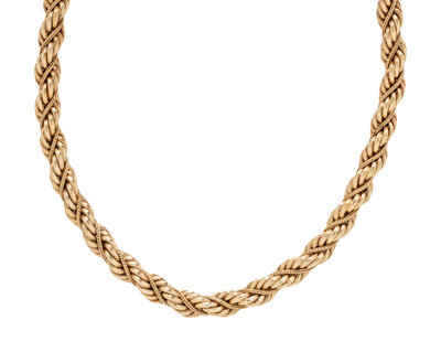 Fancy rope link chain measuring approximately 7.50 mm. 14 karat yellow gold. 15 1/2 inches long.