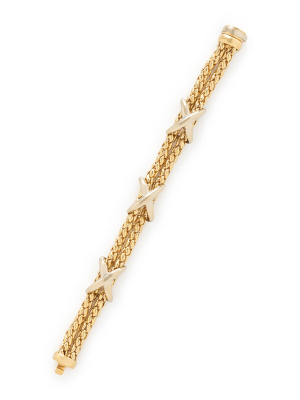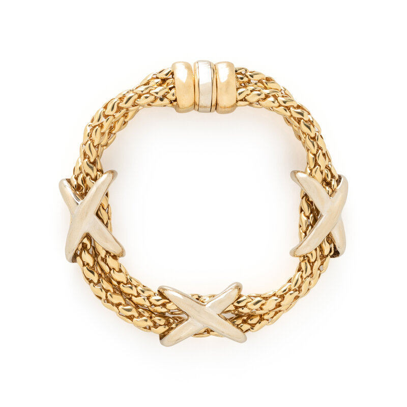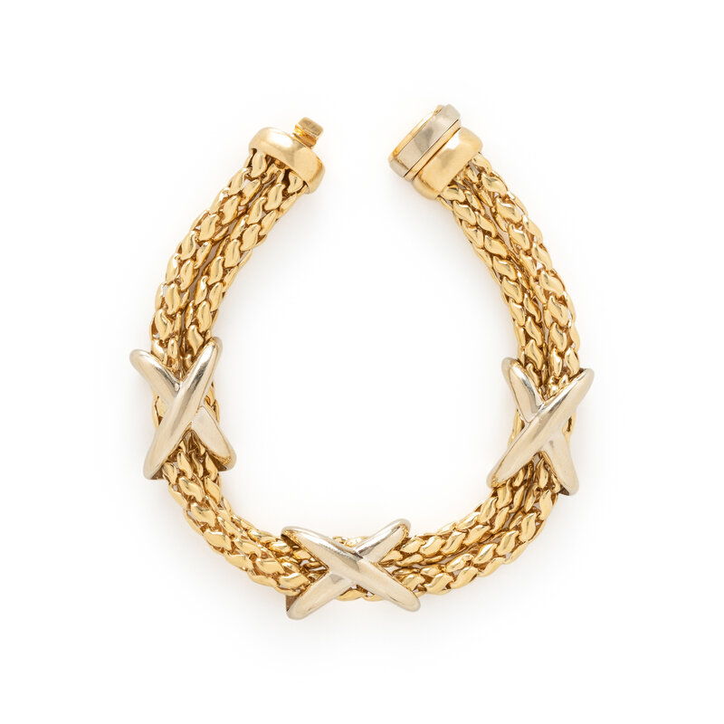 Double strand fancy link bracelet with 'X' motif slide charms measuring approximately 13.00 mm wide. 18 karat yellow gold. 7 1/4 inches long.