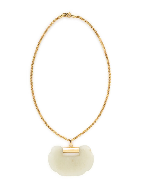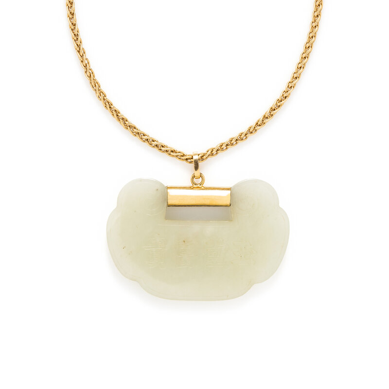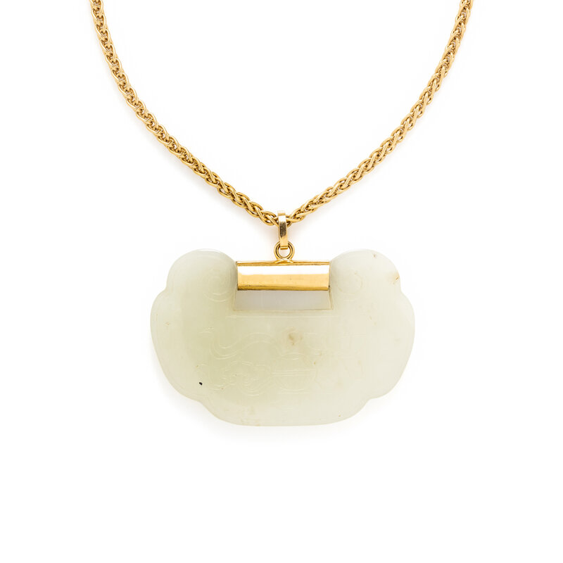 Carved jade measuring approximately 65.40 x 43.50 x 6.00. Yellow gold. 18 inches long.