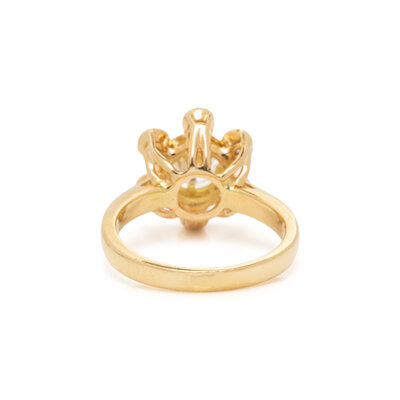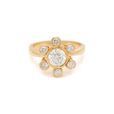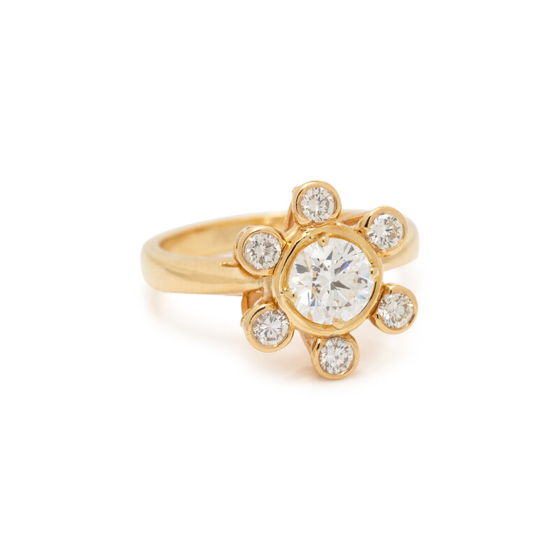 Round brilliant cut diamonds weighing approximately 1.20 carats total. Yellow gold. Ring size 6.