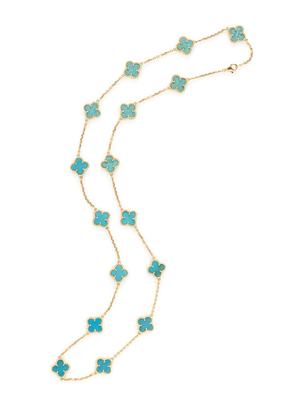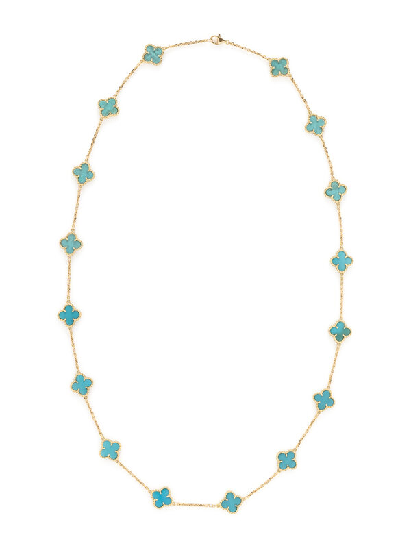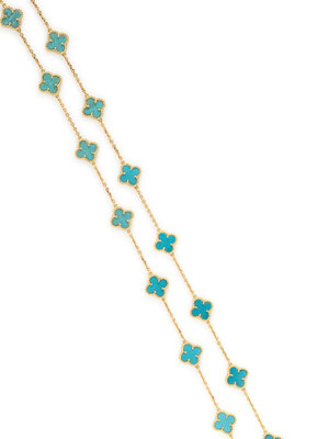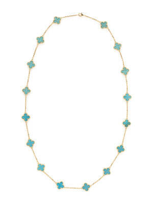 Treated turquoise quatrefoil plaques measuring approximately 13.00 x 13.00 mm. 18 karat yellow gold. 29 3/4 inches long.