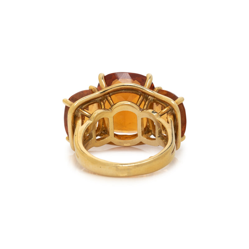 Cushion faceted citrine measuring approximately 10.35 x 8.35 x 5.50 - 14.45 x 12.50 x 7.60 mm. 18 karat yellow gold. Ring size 4 3/4.