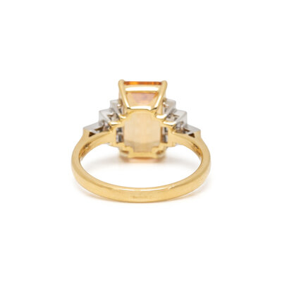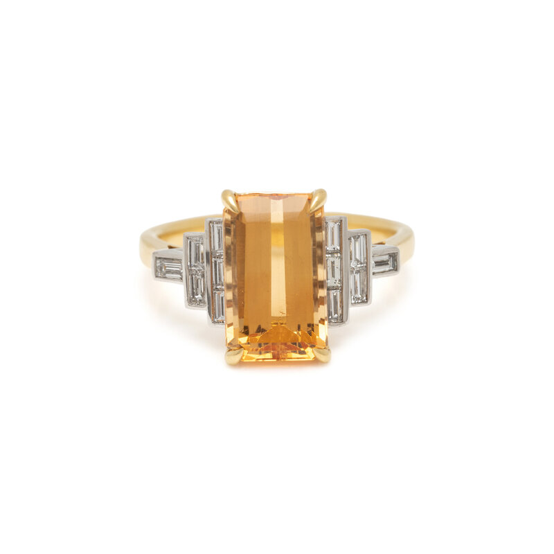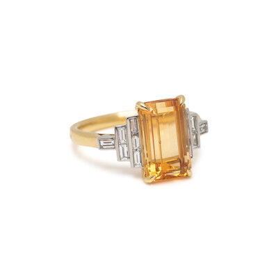 Emerald cut topaz measuring approximately 12.17 x 7.35 x 5.75 mm and baguette cut diamond accents. Platinum-topped yellow gold. Ring size 7 1/2.