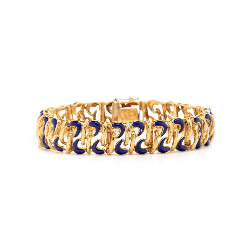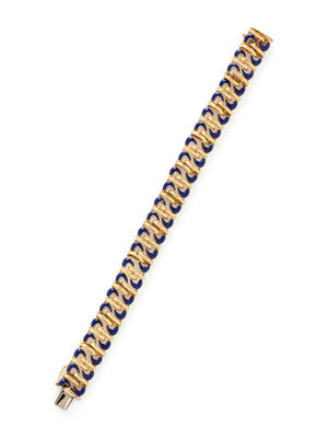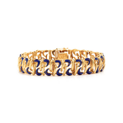 Fancy links measuring approximately 12.00 mm wide with blue enamel detail. 18 karat yellow gold. 7 1/2 inches long.