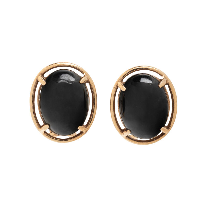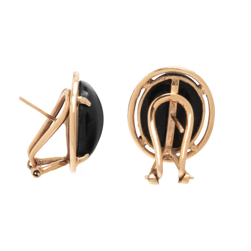 Oval cabochon black jade measuring approximately 15.90 x 11.75 x 4.80 mm, posts with clip backs. 14 karat yellow gold. 3/4 inch long.