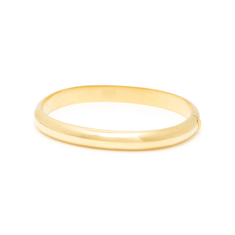 Hinged with side clasp. 18 karat yellow gold. 7 inches inner circumference.