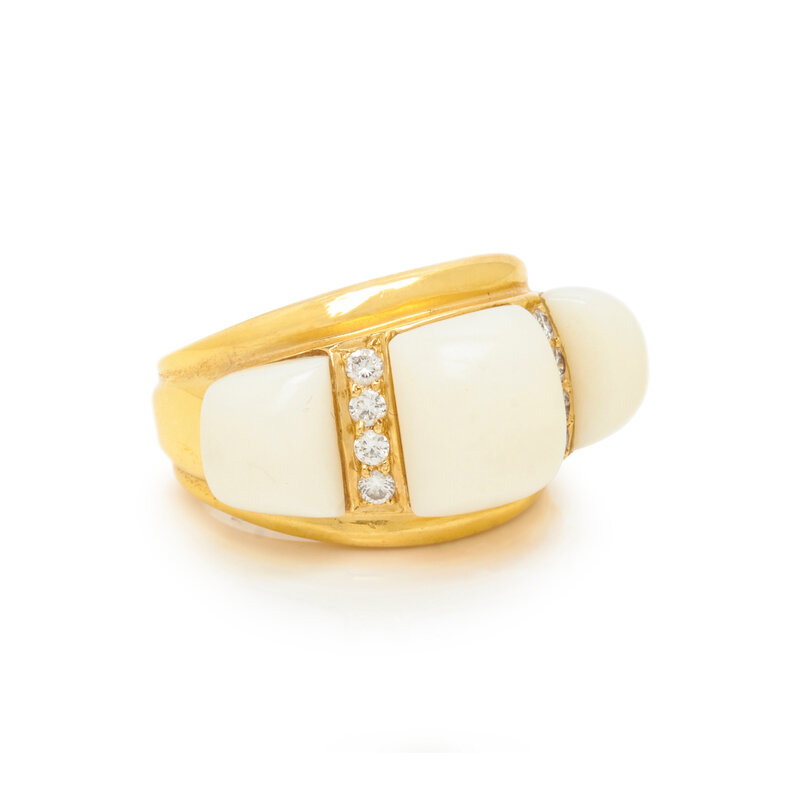 White coral and round brilliant cut diamonds. Yellow gold. Ring size 6 1/4.