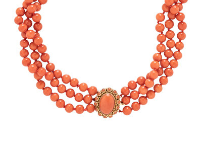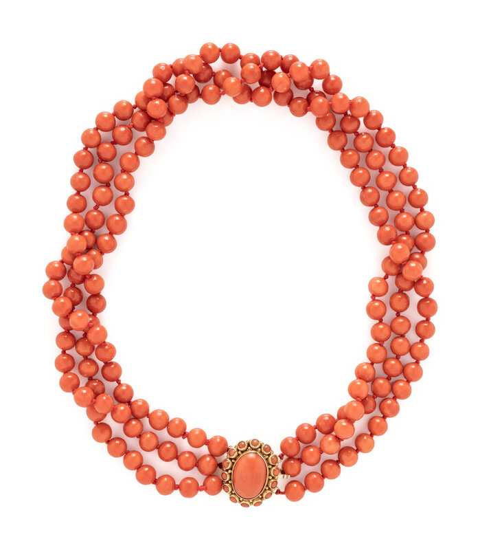 Coral beads measuring approximately 6.00-6.50 mm strung and knotted with coral cabochon and yellow gold clasp. 15 1/4 inches long.