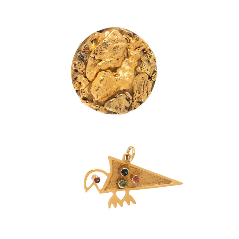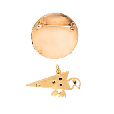 Including a brooch and a pendant set with multicolored round faceted gemstones. Yellow gold. Brooch: 1 1/8 inches wide. Pendant: 3/4 x 1 1/4 inches.