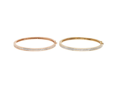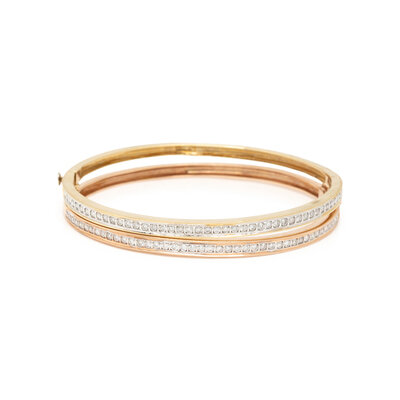 Round brilliant cut diamonds weighing approximately 1.00 carat total, hinged with side clasp. 14 karat yellow and rose gold. 6 1/2 and 6 1/2 inches inner circumference.