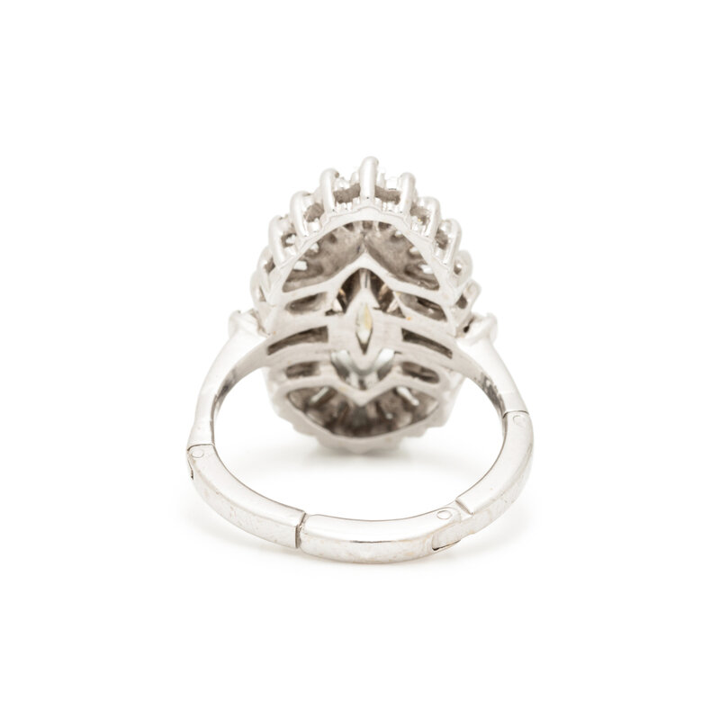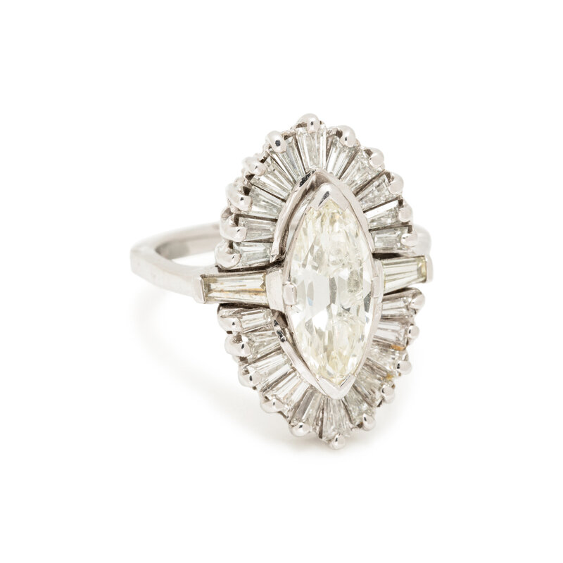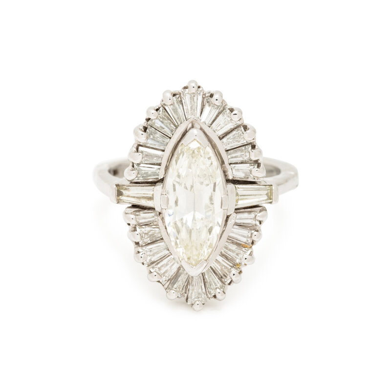 One modified marquise brilliant cut diamond weighing 1.43 carats and tapered baguette cut diamonds weighing approximately 1.25 carats total. White gold. Ring size 7 1/4.