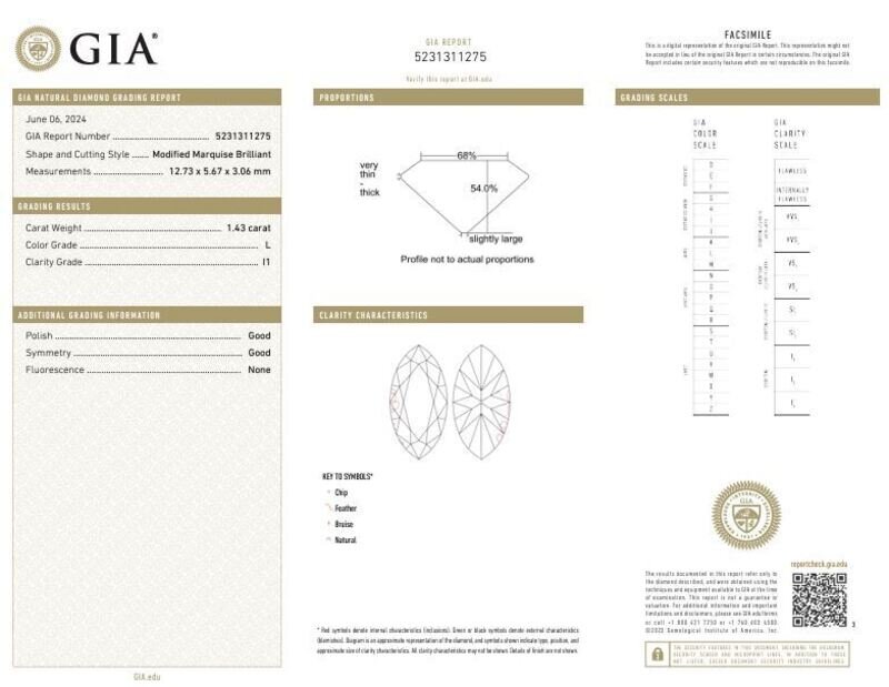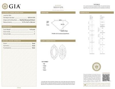 GIA, 2024, Report No. 5231311275, 1.43 carats, L color, I1 clarity, No fluorescence