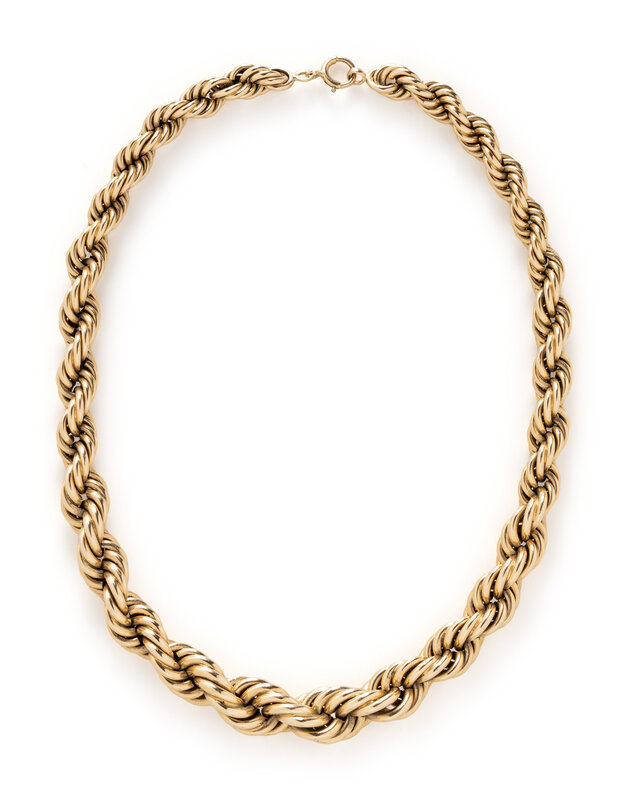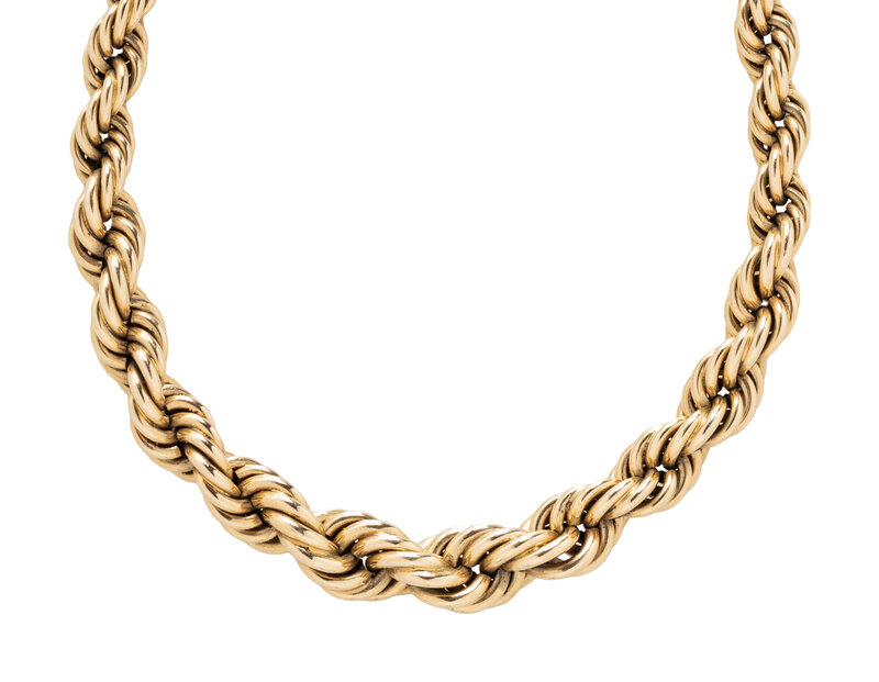 Graduating rope link chain measuring approximately 7.50-12.00 mm. 14 karat yellow gold. 15 1/2 inches long.