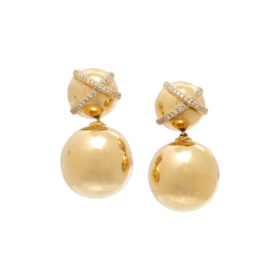 Round brilliant cut diamond detail on gold sphere suspending a larger sphere. 18 karat yellow gold. 1 inch long.