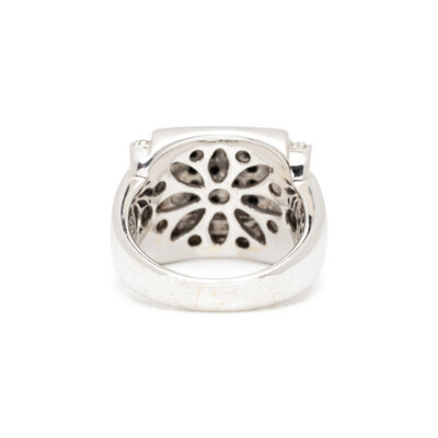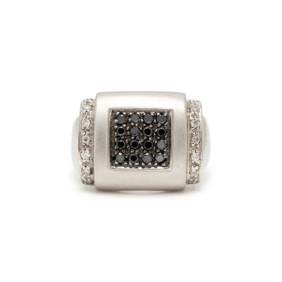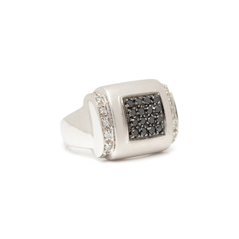 Round brilliant cut diamonds and black diamonds. 14 karat white gold. Ring size 6 3/4.
