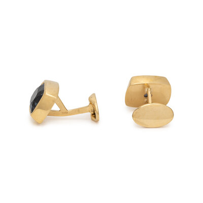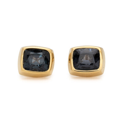 Cushion cut gray spinel each measuring approximately 11.20 x 9.65 x 6.60 mm. 18 karat yellow gold. 7/16 x 1/2 inch.