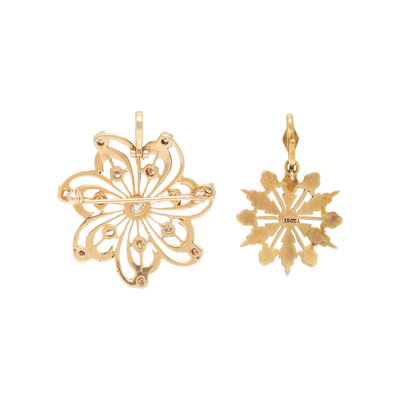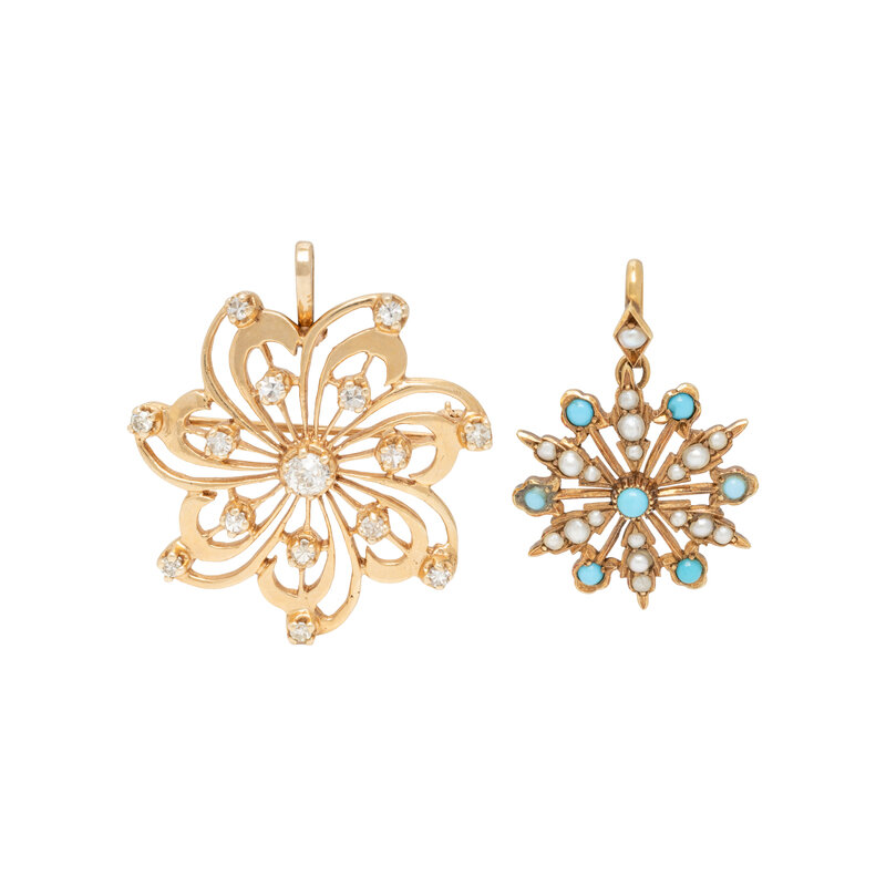 Including a pendant/brooch set with old European cut and single cut diamonds, and a pendant set with seed pearls and round cabochon treated turquoise measuring approximately 1.95 - 2.65 mm. Yellow gold. 1 3/8 x 1 1/4 inches and 1 1/4 x 7/8 inches.