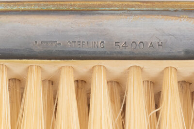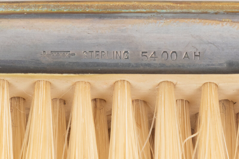 comprising a hand mirror, shoe horn, powder jar, button hook, scissor, comb spine, handled buffer, and three clothes brushes.