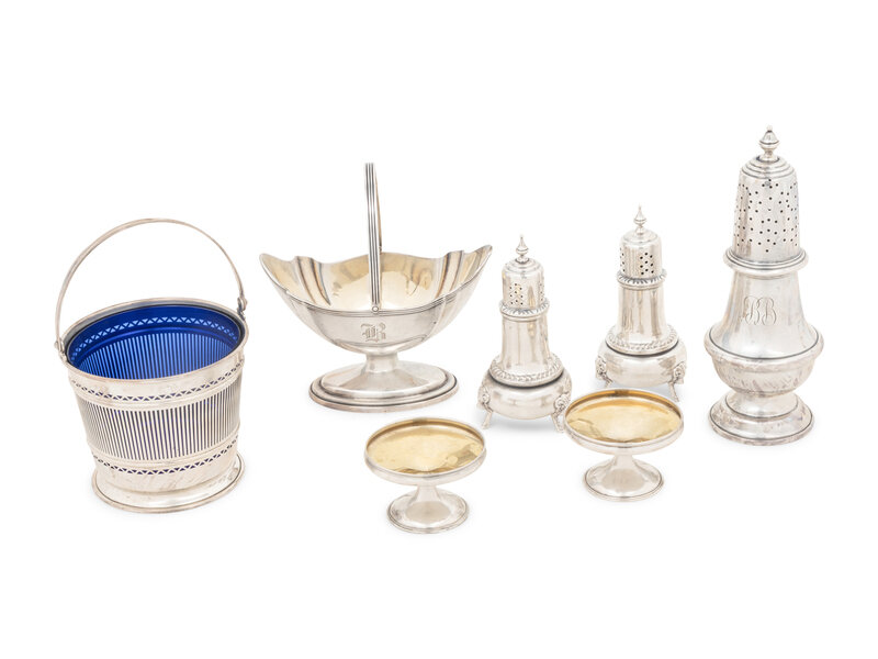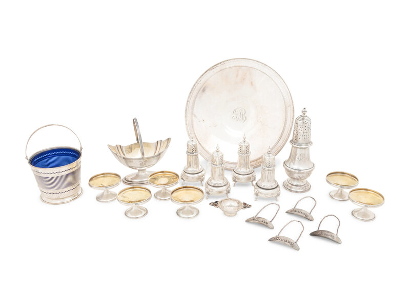 comprising a muffineer, a set of four casters, a set of four liquor tags, a set of six footed salts, a sugar basket, a footed circular tray, a miniature quaich and a pail with a removable cobalt glass liner; 19 items total.