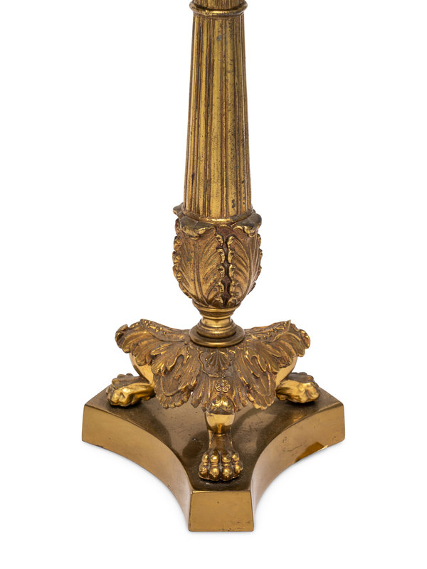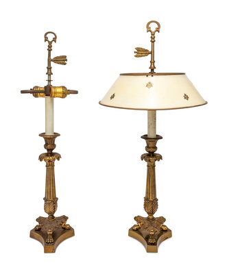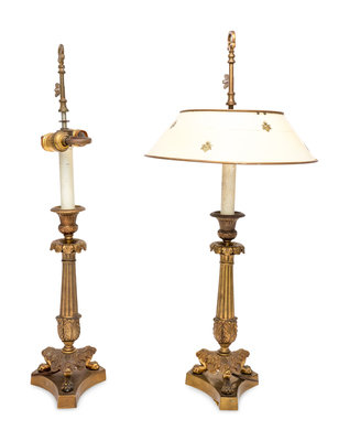 A Pair of Empire Style Gilt Bronze Candlesticks Mounted as Lamps