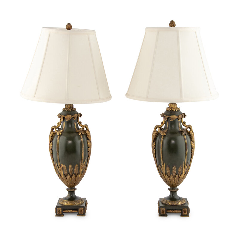 A Pair of Continental Gilt and Patinated Metal Urns Mounted as Lamps