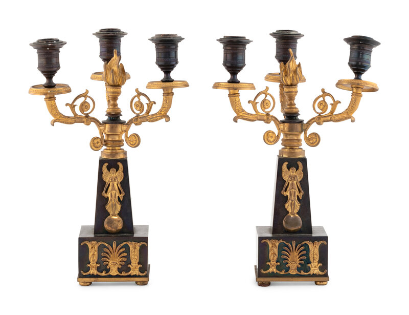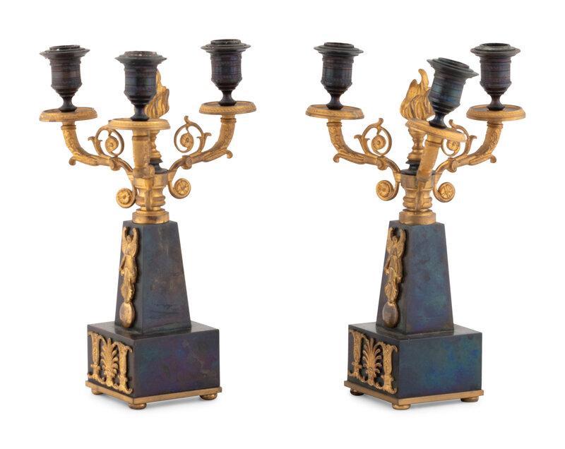 A Pair of Empire Style Gilt and Patinated Bronze Three-Light Candelabra