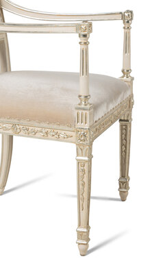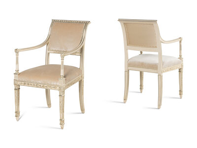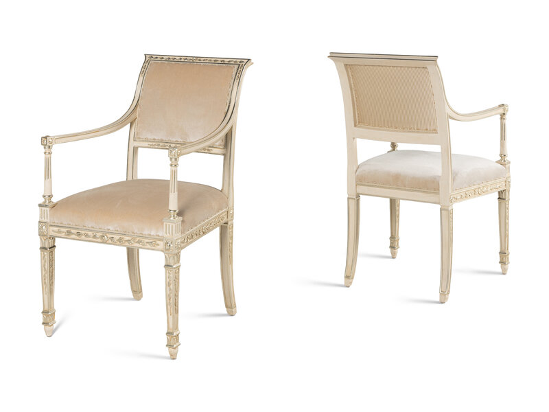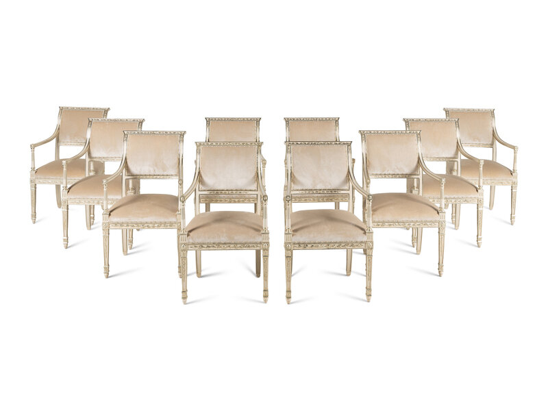 A Set of Ten Dennis and Leen Painted and Parcel Gilt Dining Chairs