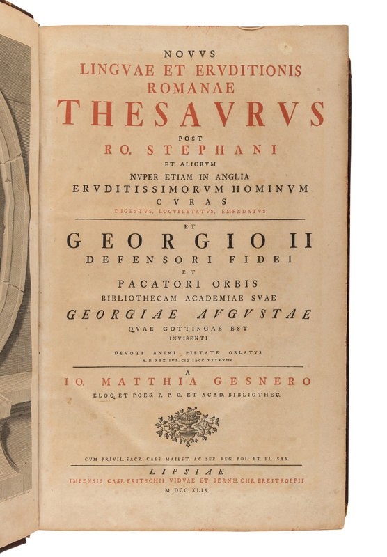 GESNER, Johannes Matthias (1691-1761). Novus Linguae et Eruditionis Romanae Thesaurus. [Leipzig]: Impensis Casp. Fritschii Vidvae et Bernh. Chr. Breitkopfii, 1749.