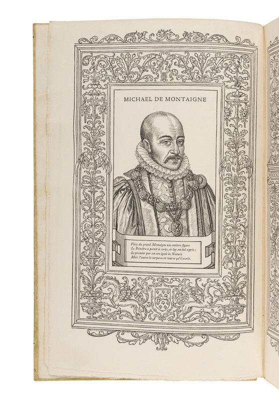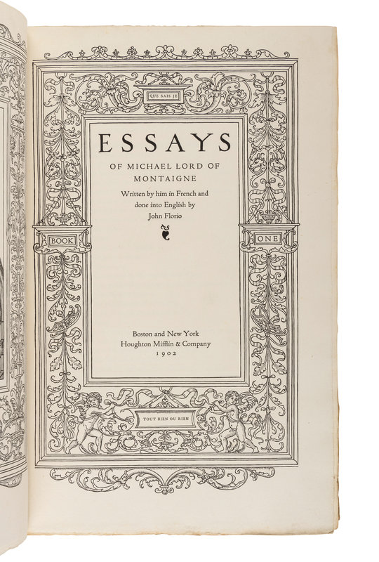 LIMITED EDITION, number 185 of 265 copies printed at the Riverside Press. "The project of printing Essays of Montaigne in three folio volumes had been considered from the first, and in view of the imposing scale of the work it was decided to have a special type cut for it which would have boldness and distinction in as large a size as sixteen-point" (Warde, pp. 13-14). Designed by Bruce Rogers, this edition was printed in Bruce's Montaigne type and also includes ornamental title-pages, frontispieces, head-pieces, and capitals designed by him while at the Riverside Press. Warde, Bruce Rogers, 33.