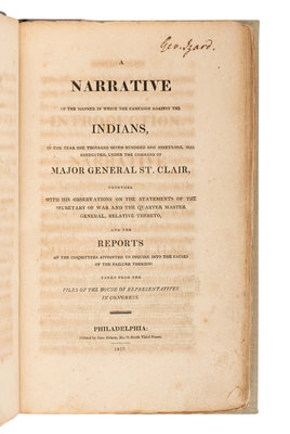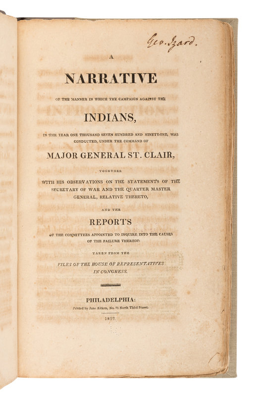 THE GEORGE IZARD COPY. During 1791 and the events St. Clair describes, Izard attended Columbia College (then King's College), graduating a year later at the age of 15. By the publication of St. Clair's A Narrative in 1812, Izard was the Colonel of the Second Artillery Regiment in anticipation of war with England and was later promoted to Major-General. Following the War of 1812, Izard lived a secluded life of scholarship, actively participating in the American Philosophical Society. On 4 March 1825, President Monroe appointed him Governor of the Arkansas Territory, a role Izard held until his death in 1828. Izard's tenure was controversial due to his success in forcing the relocation of the Quapaw and Choctaw tribes to reservations, and condemnation by the "unruly frontier legislature" for his "dictatorial manner toward them"(ANB). Shaw and Shoemaker, American Imprints, 26682; Field 1349; Graff 3639; Howes S-24; Sabin 75020; Thomson Ohio 1012. A FINE ASSOCIATION COPY.