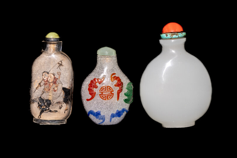the first a red, green and blue overlay snowflake ground 'bats and longevity' example, the second a glass imitating white jade example and the third an inside painted example.