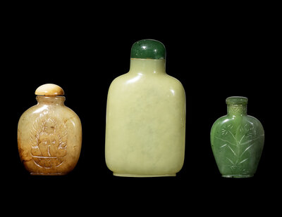 comprising a rounded rectangular form example, a carved 'Buddhist' example and a carved 'butterfly and leaves' example.