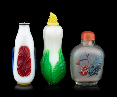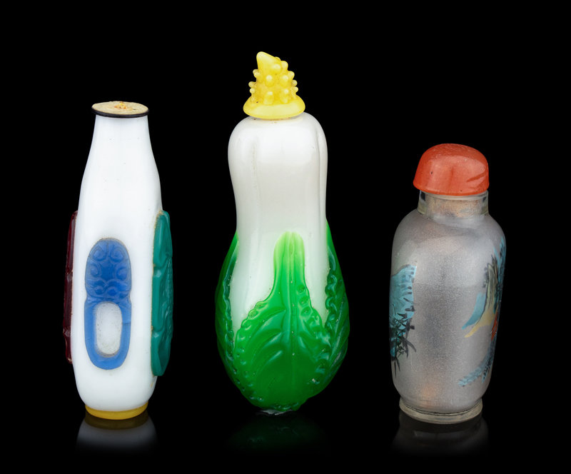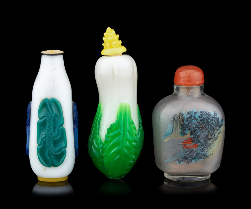 the first a multi-colored overlay white Peking glass example, the second a green overlay white Peking glass 'cabbage' example, the third an inside painted 'landscape' example.