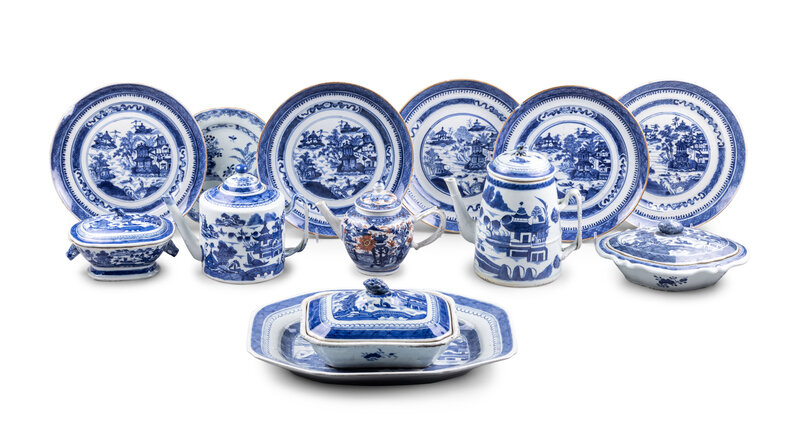 comprising two vegetable dishes and covers, a platter, six plates, two teapots, and a coffee pot.
