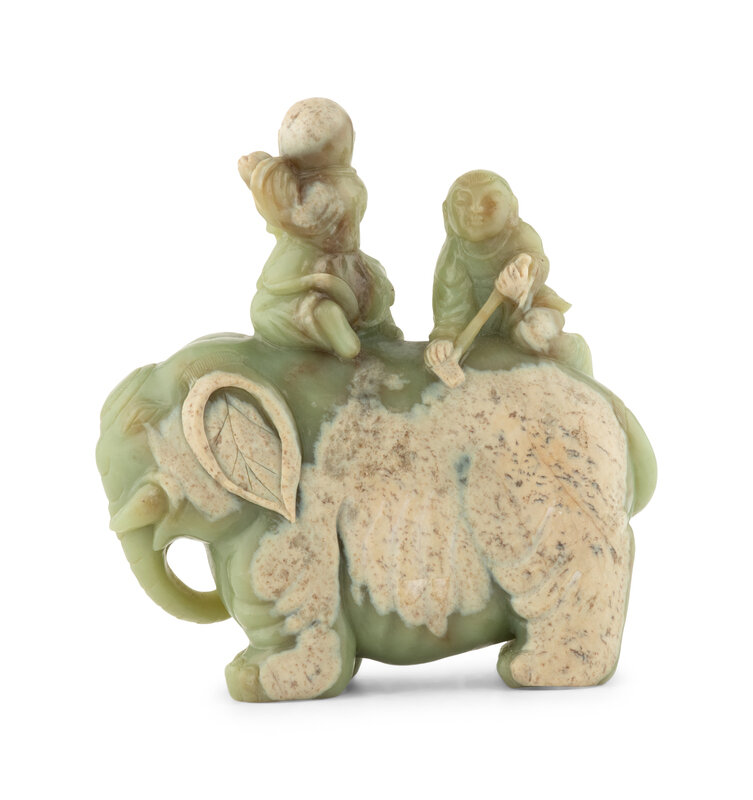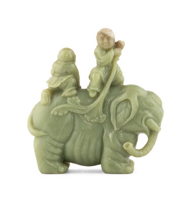 A Chinese Celadon Jade Figural Group of Boys Riding an Elephant