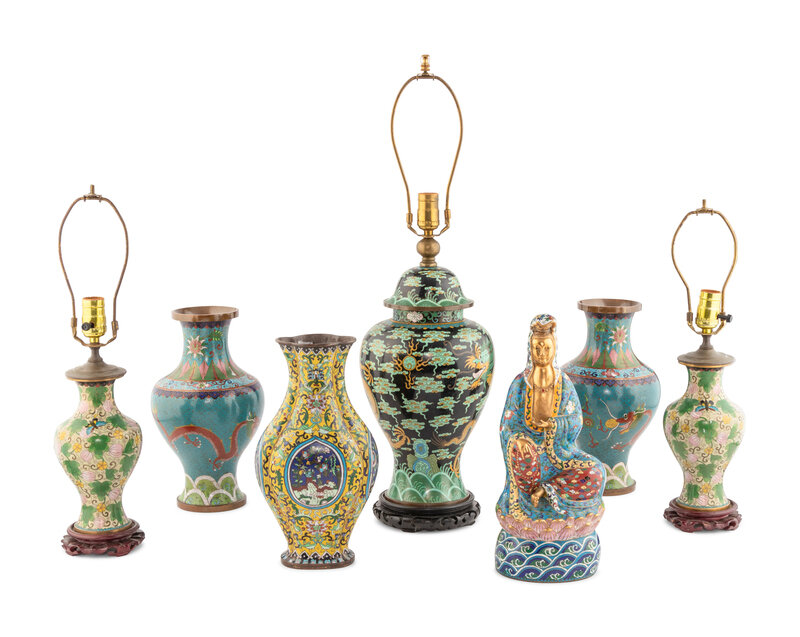 two pairs of vases, one vase mounted as a lamp, one vase and one figure of guanyin.