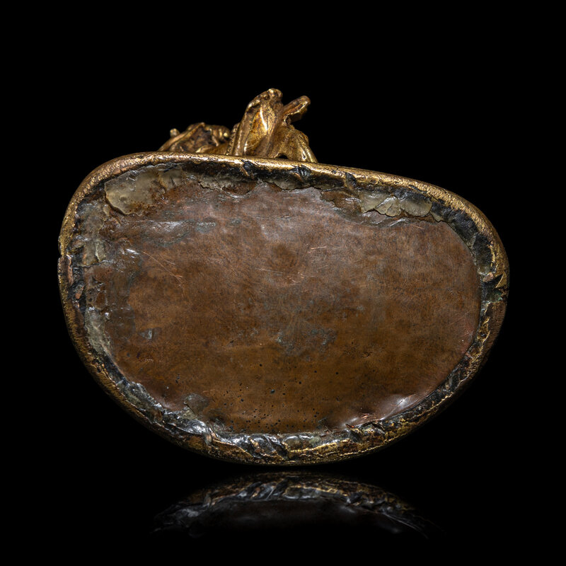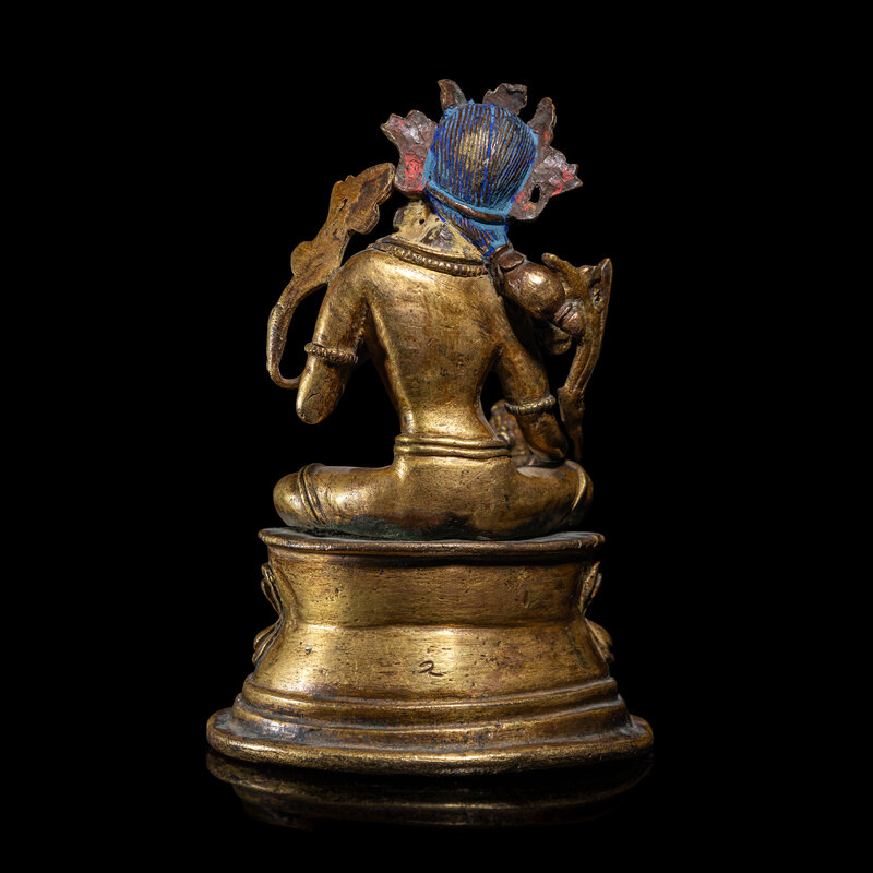 The seated figure joined to a separately cast tapered double lotus base; the goddess with two lotus blossoms at the shoulders with trailing stems held in her hands, one in vitarka mudra the other in varada mudra, and holding a treasure vase. The underside is sealed.