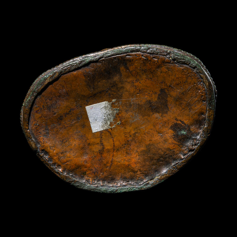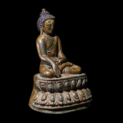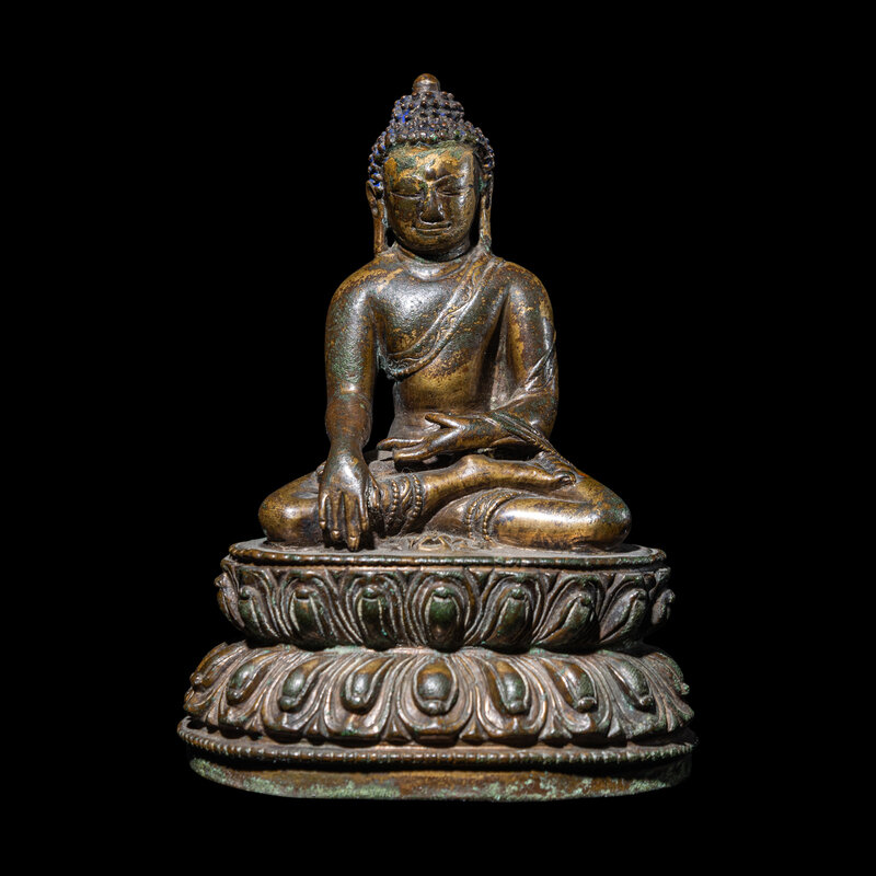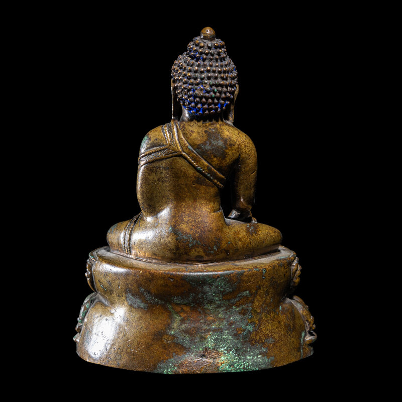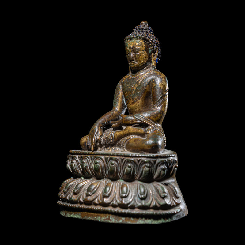The Buddha is depicted seated in vajrasana and with hands in bhumisparsha mudra, raised on a tapered double lotus base, sealed.