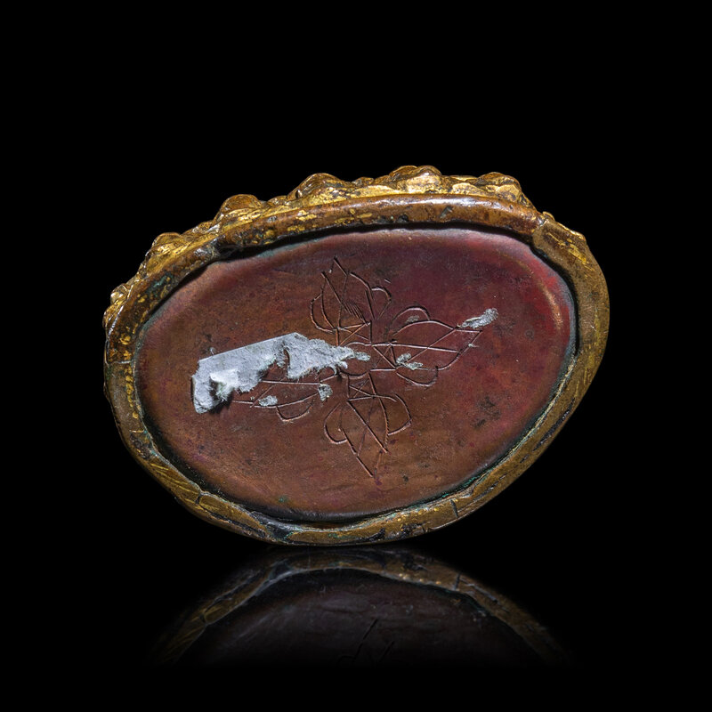 The Buddha is seated in vajrasana, with hands in bhumisparsha mudra, calling the earth to witness his enlightenment, all on a double lotus base, underside sealed, base plate incised with a vishvavajra.