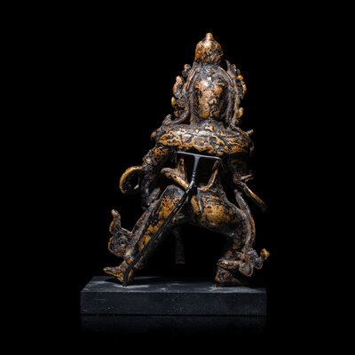 The crowned ithyphallic deity in a powerful martial stance, his face with wrathful expression, holding a sturdy mongoose, spitting gems, in his left hand and a capala in his right hand; adorned with earrings, armlets, anklets, and necklace. Empty consecration recess to the back. Later stand.