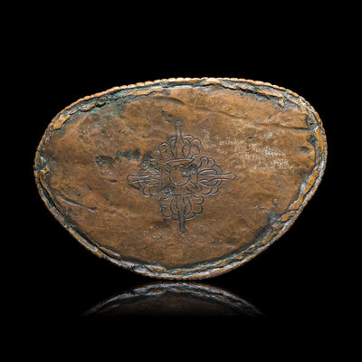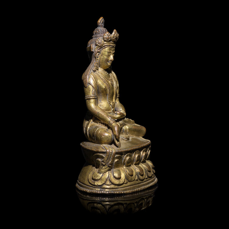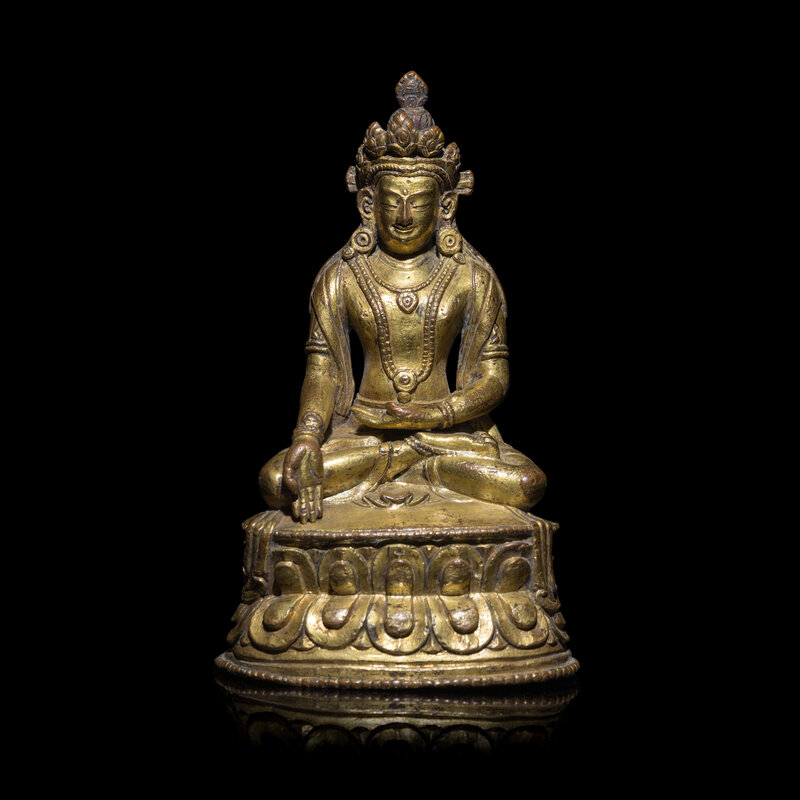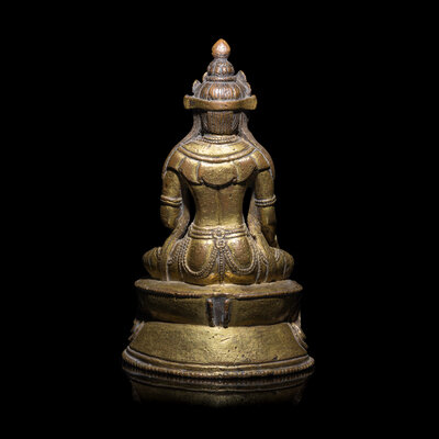 Seated in a vajrasana one hand in dhyana mudra, the other lowered hand in varada mudra, clad in trailing scarves and with heavy jewelry, his crown with five floral leaves, all raised on a double lotus base, underside sealed, a vishvavajra incised to the plate.