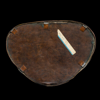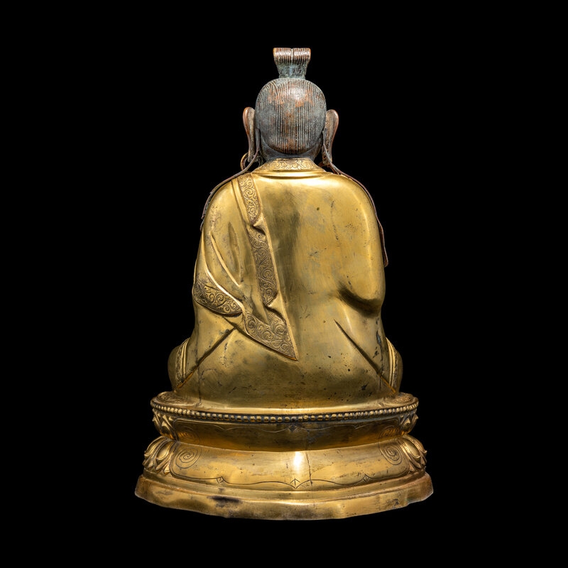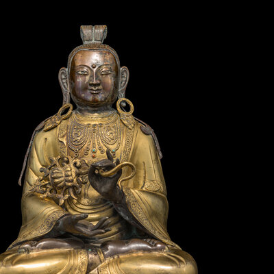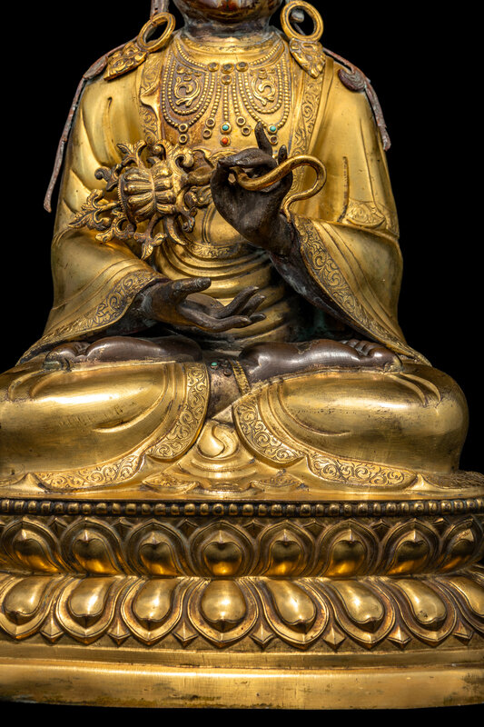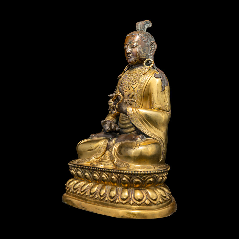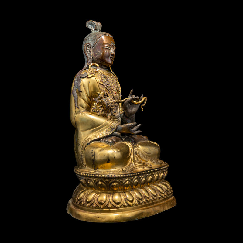 Seated in vajrasana, holding a lotus in one hand, all on a double lotus base, underside sealed and incised with a vishvavajra.