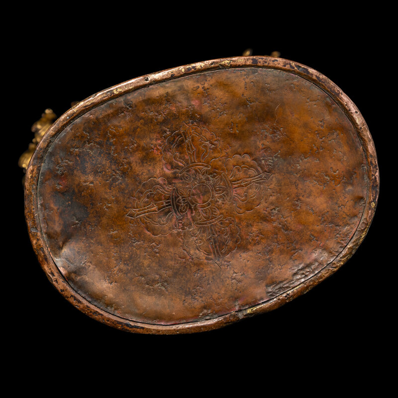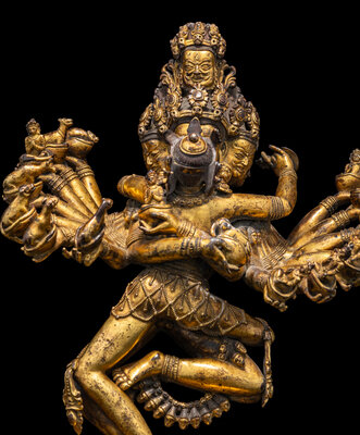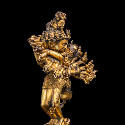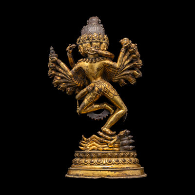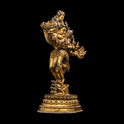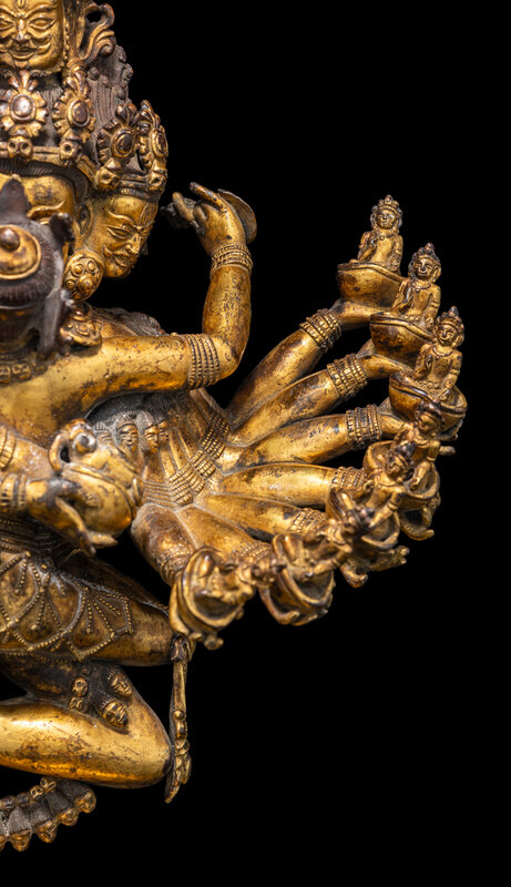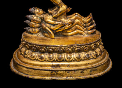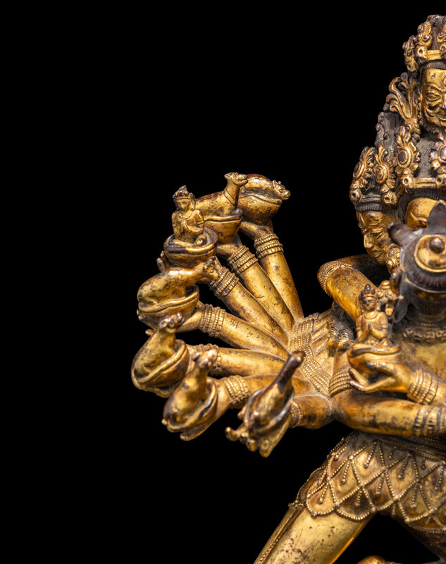 The complex modeled figure represents Hevajra in union with his consort Nairatmya, both decorated with bejeweled heavy garments, along with a garland of skulls, his dazzling featured sixteen arms, each holding a bowl of with deity or sacred animal, in a symbolic dancing posture, the eight-head deity standing on four corpses, suggesting his triumph over ignorance and evil, all above the lotus stand, the underside of stand with a incised vajra sign.