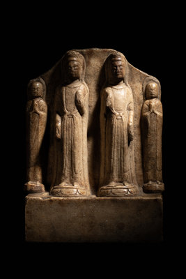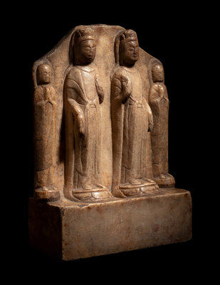 In Northern Qi style, carved in high relief to show a pair of twin figures of standing Guanyin flanked to either side with short attendants. Each Guanyin is shown standing above a compressed domelike lotus stand, clad in draping robes fastened with sashes at the waist. All above a rectangular base, and back by a worn aureole.