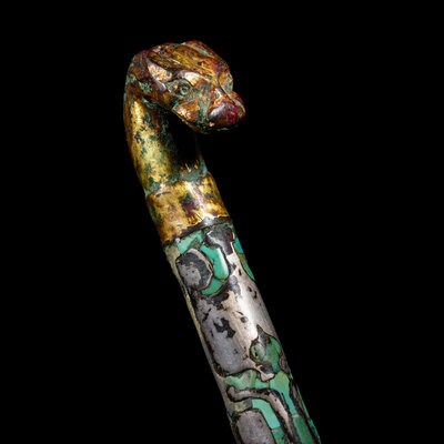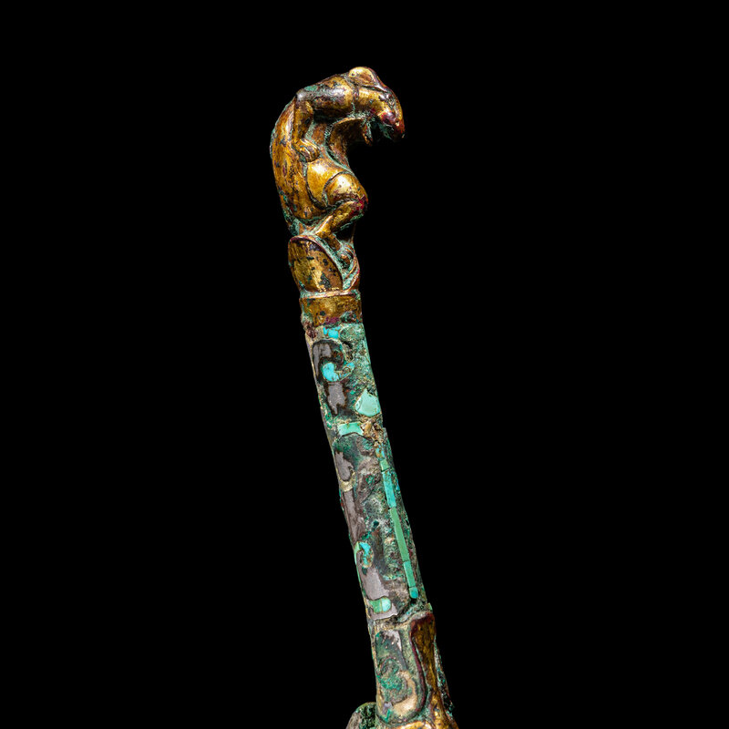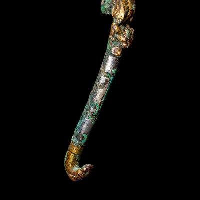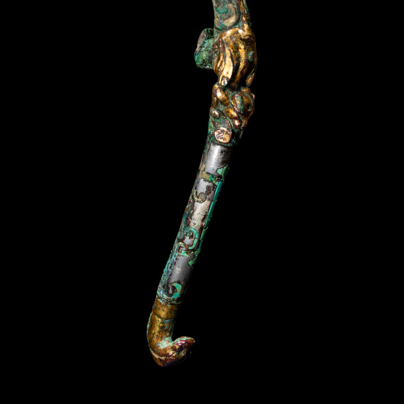 A Chinese Gilt, Silvered and Turquoise Inlaid Bronze Belt Hook, Warring States Period