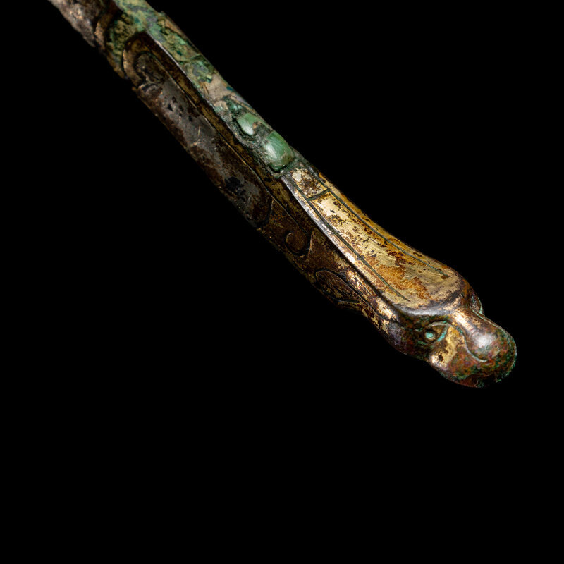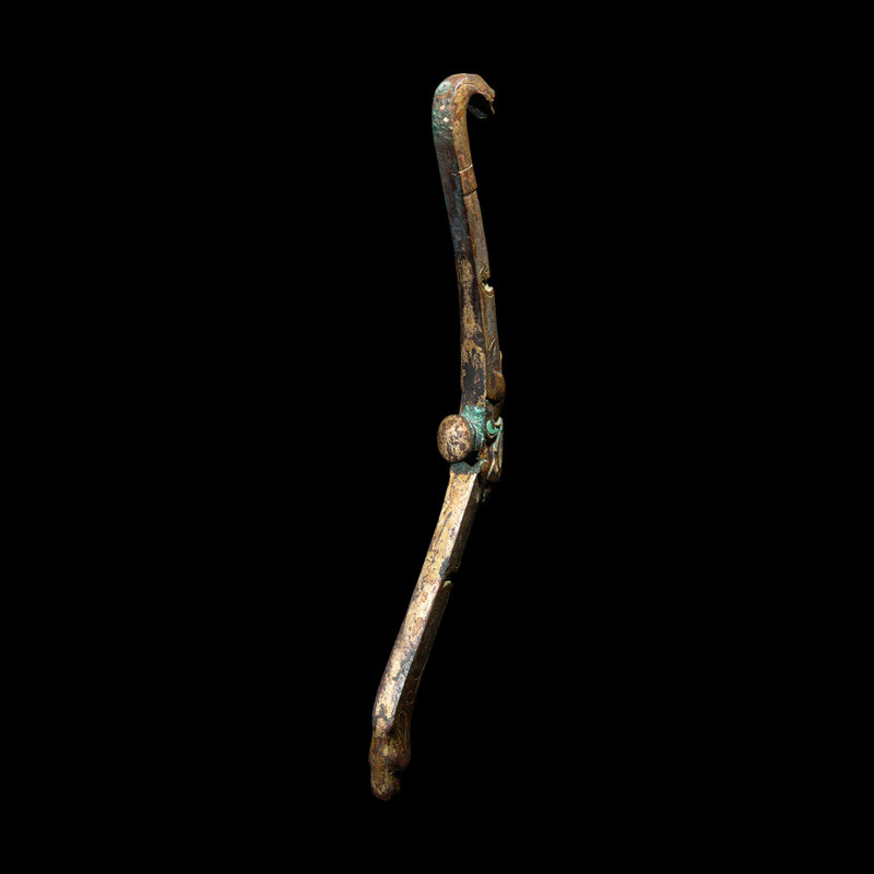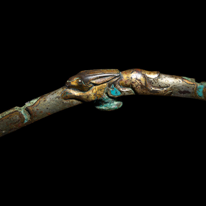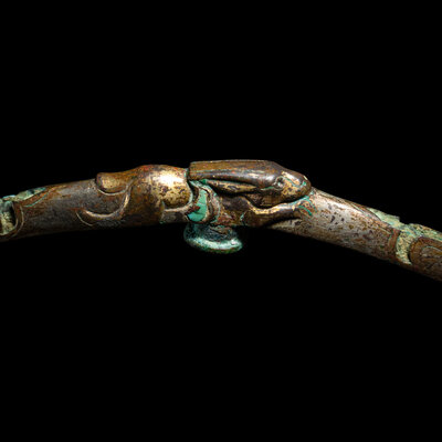 戰國 鎏金銅錯銀嵌松石雙獸首奔兔帶鉤