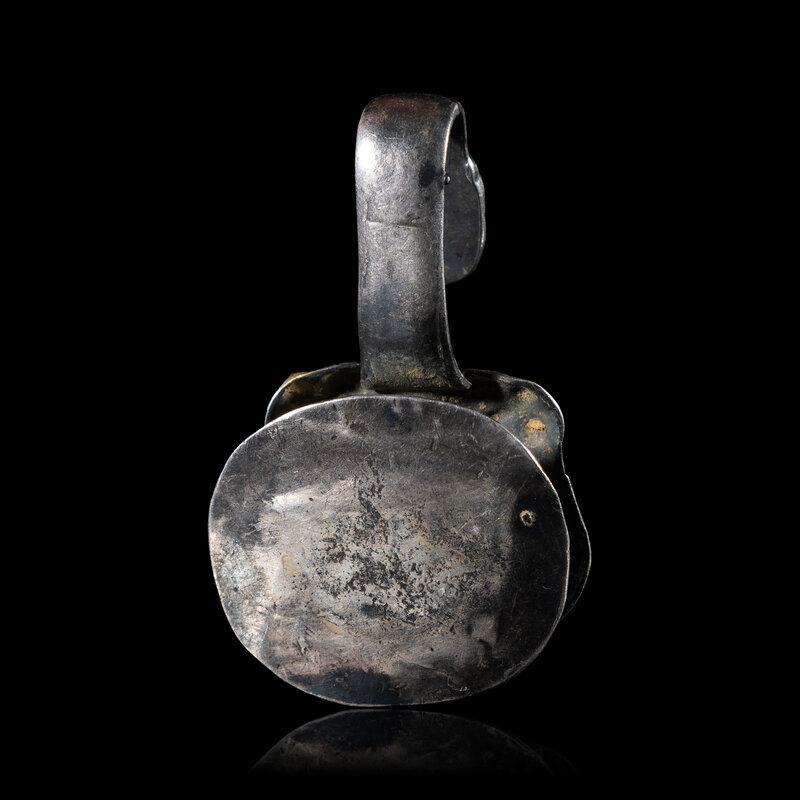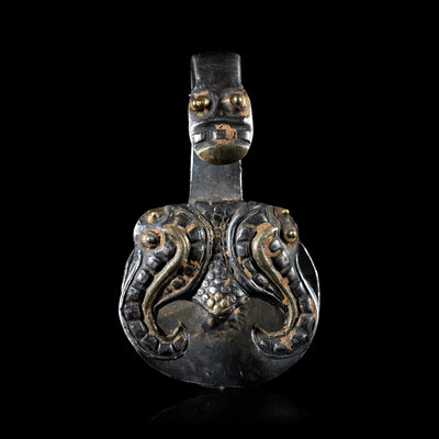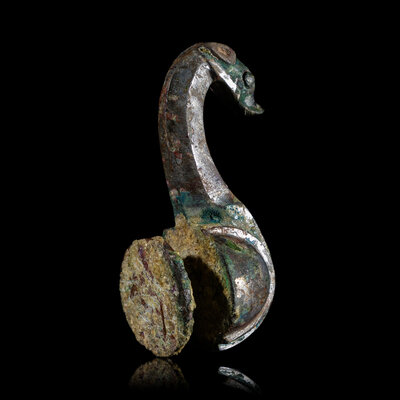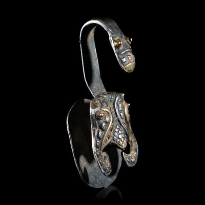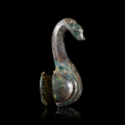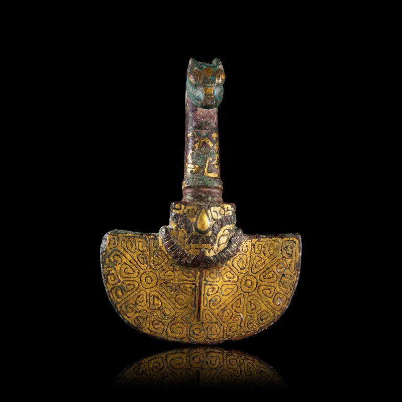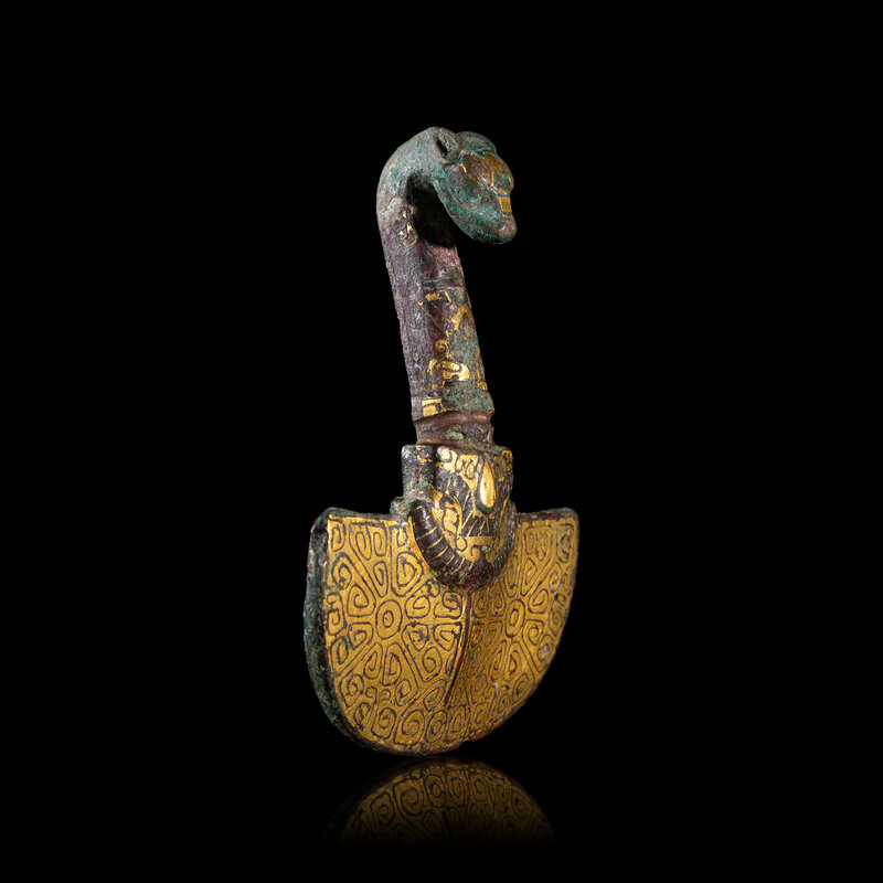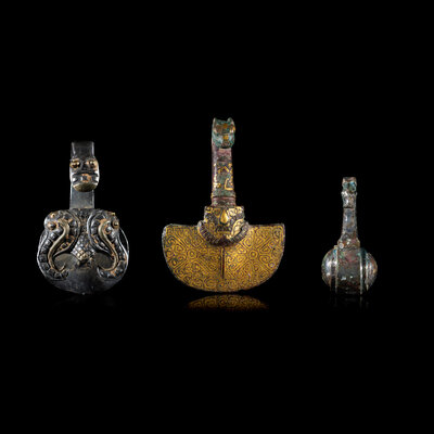 The first is a gold inlaid copper alloy example with a wide, axe-head form panel inlaid with gold geometric designs, below a raised taotie mask connecting to a short shaft decorated with further gold inlays, terminating in a dragon head-form hook, the underside cast with a round button; a parcel-gilt silver ‘chimera’ garment hook, the front panel in the shape of a pair of wings chased with geometric designs, surmounted by a short and flat shaft and a beast-head form hook, the reverse with a large round button; a small silvered metal example with a chilong-head hook, the reverse with a round button.