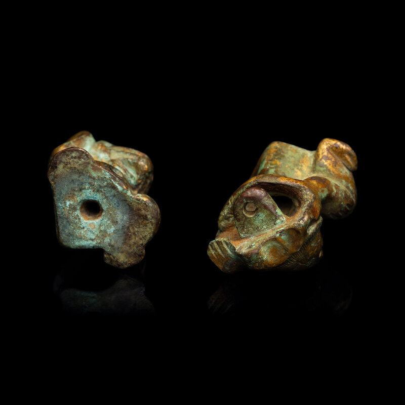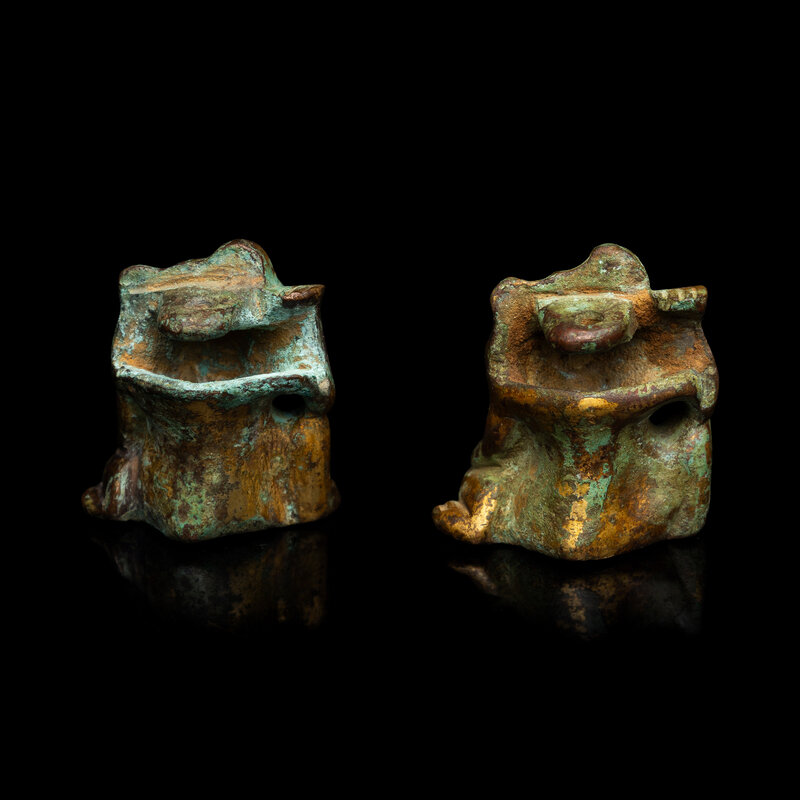 Each figure cast seated with the head lowered with eyes looking downwards, the mouth slightly open revealing the sharp teeth, the left paw placed atop the left leg, the hollow eyes and the round opening on the belly originally for hardstone inlays, the figure backed by a perforated lug for attachment.