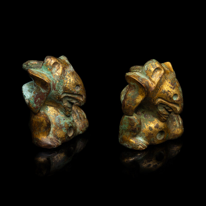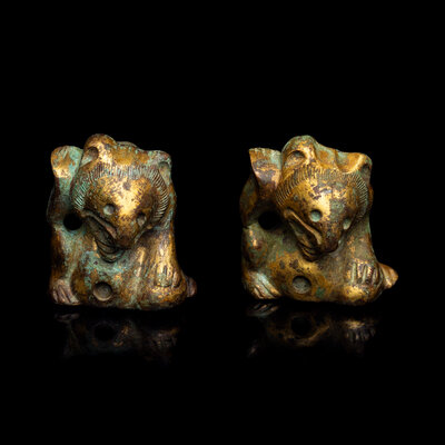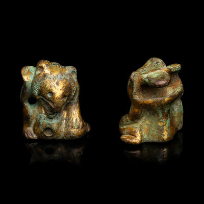 A Pair of Small Chinese Gilt Bronze Bear-Form Supports, Han Dynasty