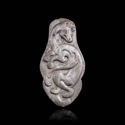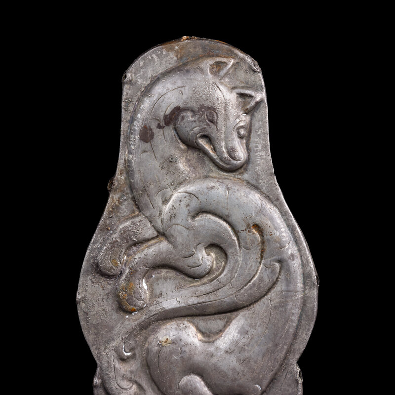 The elongated plaque is decorated in repoussé with a crouching winged fox with its head turned backward, its mouth slightly open as if showing a subtle smile; the edges having small punched holes for fastening the piece to the harness.